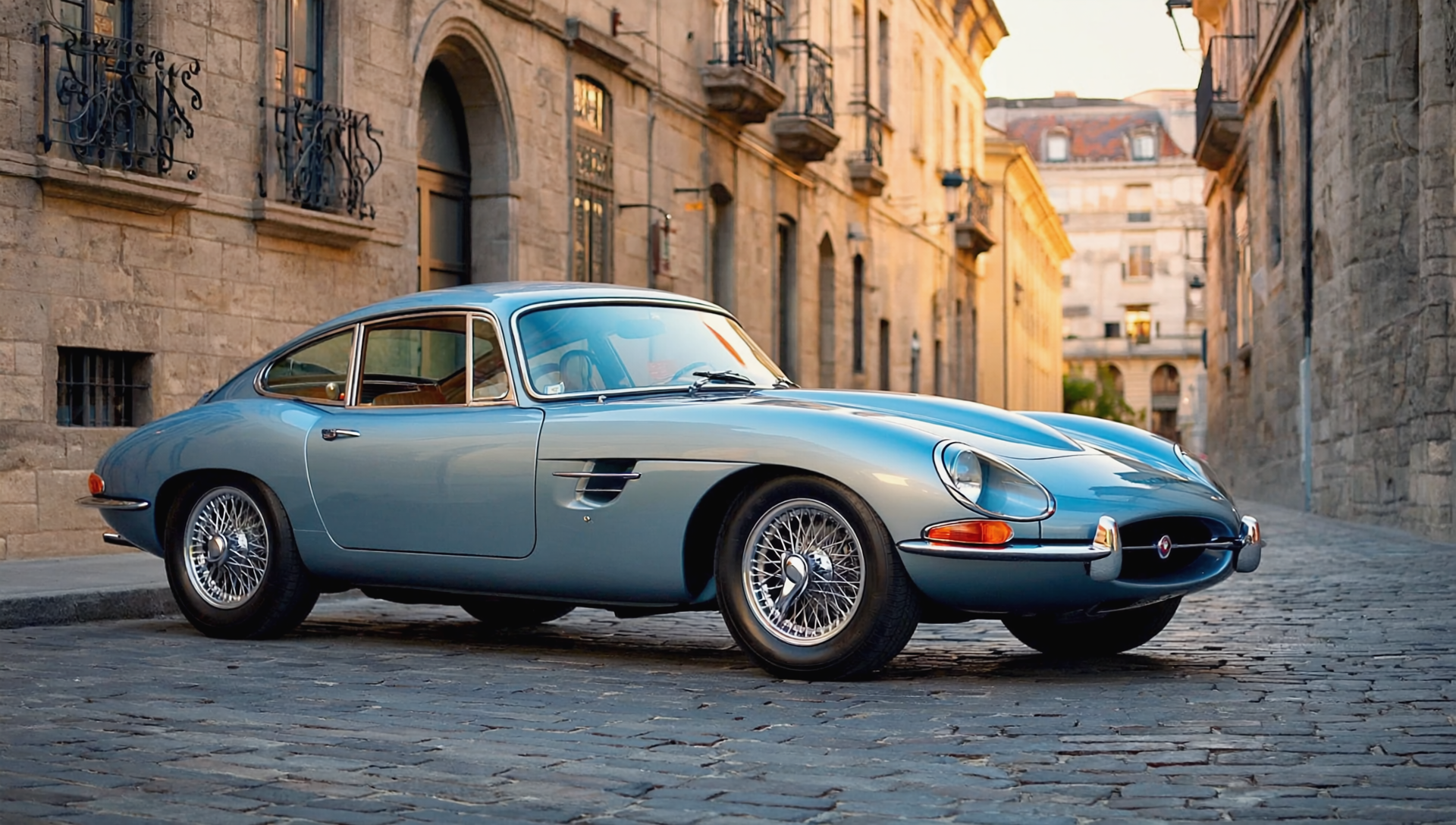 ヨーロッパの街中に停車するライトブルーの車【フリー画像素材&動画素材】